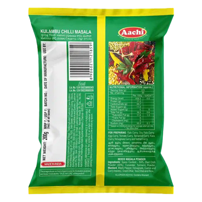Each pack of Aachi Kulambu Chilli Masala is carefully blended to provide the perfect combination of spices, ensuring your kulambu tastes just right every time.