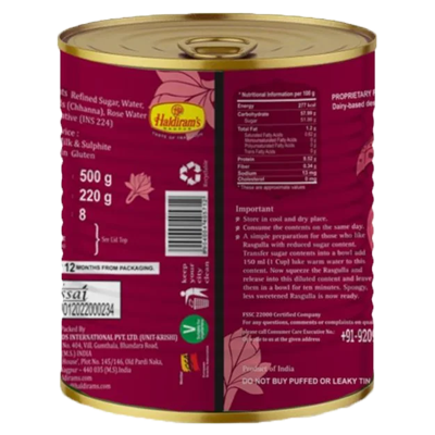 Haldirams Rasgulla is a classic Indian sweet made from soft, spongy balls of chhena (cottage cheese) soaked in light sugar syrup. This traditional Bengali dessert is loved for its melt-in-the-mouth texture and mildly sweet flavor. Packed in a sealed tin, it ensures freshness and authentic taste, making it a perfect treat for festivals, celebrations, or after-meal indulgence.